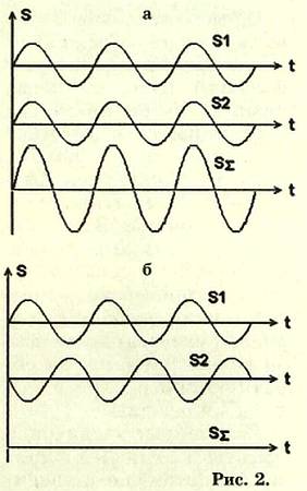 Интерференция — это наложение двух или более когерентных волн. Результат зависит от взаимной разности фаз приходящих в данную точку наблюдения волн. Если фазы совпадают (рис. 2а), то происходит сложение амплитуд колебаний (усиление света, улучшение радиоприема). Если же фазы противоположны (рис. 2б), то происходит вычитание амплитуд, свет ослабевает, радиоприем ухудшается.