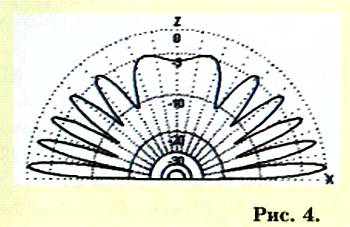 Дальнейшее увеличение высоты даст новый минимум, а потом снова максимум… Это иллюстрирует диаграмма направленности (ДН) простой дипольной передающей антенны, расположенной на высоте трех длин волн над поверхностью земли (рис. 4).