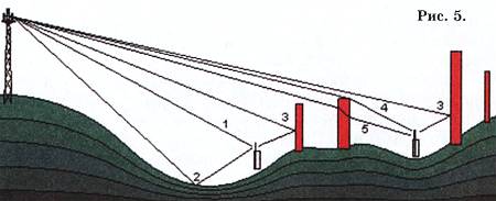 Для приемника справа, находящегося в тени, ситуация еще хуже: кроме отраженного луча 3 есть луч 4, дифрагировавший на крыше затеняющего здания (дифракция — это огибание волной препятствия), и луч 5, частично ослабленный стенами. Такое распространение создает пеструю интерференционную картину, и уровень сигнала может изменяться в сотни раз при перемещении антенны на расстояние, сравнимое с длиной волны, а на УКВ это всего единицы метров.