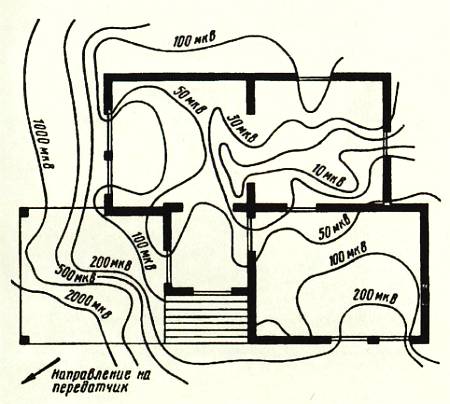 Представление о том, как изменяется уровень сигнала УКВ-радиостанции в помещении, дает рисунок из книги «Receptia emisiunilorde televiziune in UIF» (Editura tehnica, Bukuresti, 1972). На нем уровень сигнала изменяется в пределах дома более чем в 200 раз и радиоволны проникают в дом преимущественно через окна и двери. Подобное распределение уровней сигнала наблюдается в каждой квартире.