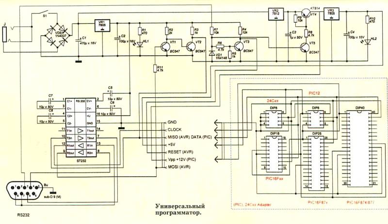 Он собран на микросхеме МАХ232, которая является преобразователем уровней COM-TTL, и буферной микросхеме 1533ЛA3. Этот программатор использует COM-порт компьютера.