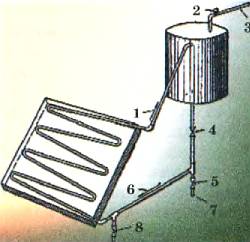 Циркуляция воды в системе по идее происходит вследствие естественной конвекции. При нагреве вода в змеевике-коллекторе расширяется, становится менее плотной, поднимается вверх по трубке и через трубу поступает в верхнюю часть бака-аккумулятора. В результате более прохладная вода у днища бака вытесняется и перетекает по другой трубе в нижнюю часть коллектора, где, в свою очередь, нагревается и поднимается в бак.