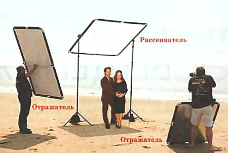 Профессионалы в таких случаях иногда приносят на пляж гору оборудования, устраивая своеобразные съемочные павильоны. Взгляните на фото: фотомодель стоит под рассеивающим экраном, заменяющим зонтик, помощник фотографа держит один отражающий экран, а в ногах у самого фотографа установлен второй отражатель.
