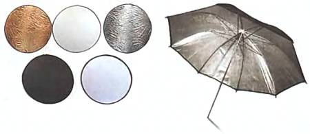 Лайт-диски из картона могут иметь самое различное покрытие. В качестве отражателя можно использовать и старый зонтик, покрасив его изнутри серебрянкой. А белый зонтик от солнца можно использовать в качестве рассеивателя. Такие приспособления удобны тем, что быстро складываются и занимают мало места.