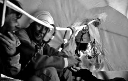 В палатке лагеря II на Южной стене Лхоцзе. Валерий Коханов, Александр Погорелов, Михаил Туркевич