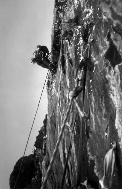 Я закрепляю нашу веревку, по ней спускается на всю длину Серега, за ним – Мысловский и Балыбердин. Потом они принимают меня с нижней страховкой. Местами приходится использовать старую, очень тонкую чужую веревку. Хорошо, что на подъеме мы добили все старые крючья и связали перебитые и протертые места. Был риск, и немалый, но иначе не спустишься, а ждать и медлить нельзя. Мороз усиливается, поднимается ветер, луна уходит за горизонт, за облака, а мы никак не можем обойти этот бесконечный «жандарм», выйти на сравнительно простой гребень, передохнуть. Мысловский все время скользит, повисает на веревке. «Кошки» надевать негде, да и некогда. Я упираюсь изо всех сил, чтобы меня не сдернули.