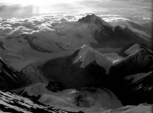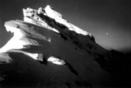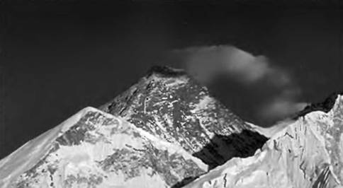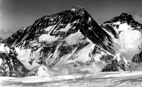 С перемычки кулуара виден Эверест. «Ну, здравствуй!», – хочется крикнуть великану. В таком ракурсе я его еще не видел. С севера дует так, что трудно стоять. Сажусь верхом на гребень, оглядываюсь. Западного цирка отсюда практически не видно. Вниз широким шлейфом уходит довольно пологий склон кулуара. На Южном седле яркие пятнышки осиротевших палаток. Там никого. Осенний сезон восхождений закончен. Экспедиции ушли из-под Эвереста. Смотрю на часы – 16. 16. Поздновато. До вершины – простой снежный склон. Закрепляю веревку на айсбайле, кричу Каратаеву, чтобы подходил, а сам пытаюсь вызвать базовый лагерь. Не получается – замерз аккумулятор. Делаю несколько снимков Эвереста, выставив время и дату съемки. Жду Володю. Через час он подходит и мы вместе идем на вершину. В 17. 55 мы на Лхоцзе! Ликовать и восторгаться нет сил. На вершине пробыли минут пять, не больше. Впереди трудная дорога вниз. Темнеет. Ветер. Мороз.