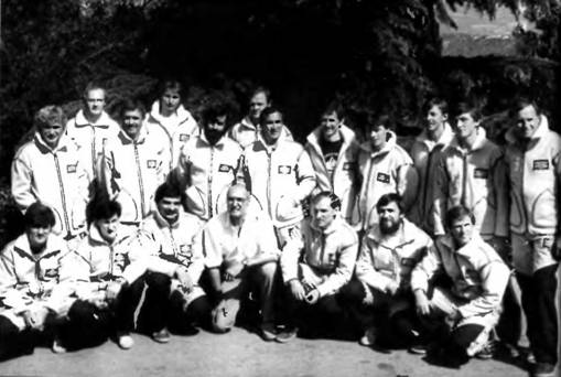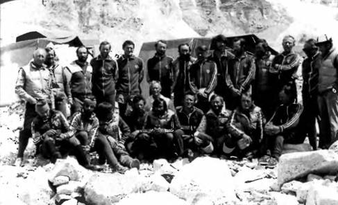 В базовом лагере Эверест, 1982 г. Сидят (слева направо): В. Хрищатый, А. Москальцов, К. Валиев, В. Иванов, М. Туркевич, В. Онищенко, С. Бершов, С. Ефимов, В. Воскобойников. Стоят: Е. Тамм, Э. Мысловский, X. Хергиани, В. Хомутов, Л. Трощиненко, В. Шопин, Н. Черный, С. Орловский, В. Венделовский, В. Пучков, Ю. Голодов, В. Балыбердин, Ю. Кононов, А. Овчинников