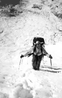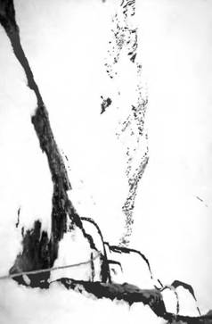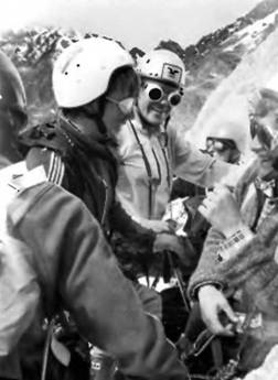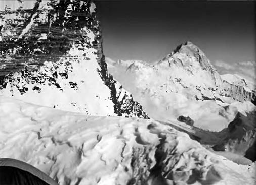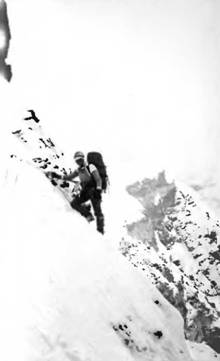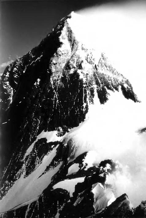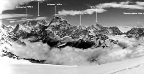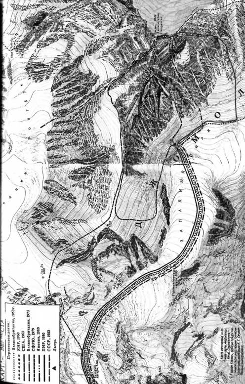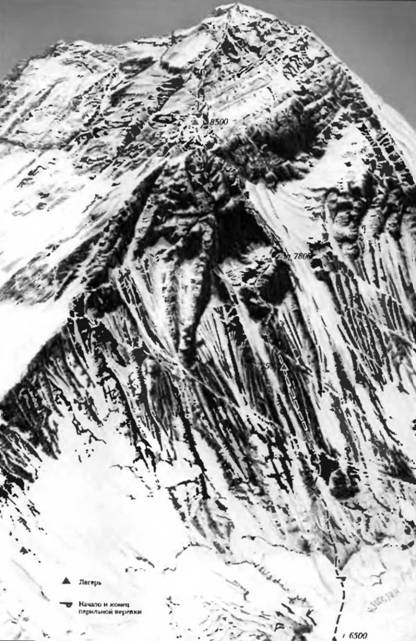… Прошли в знакомый уже кулуар. Заглянули левее грибов, а там ситуация уже другая. Снежных монстров как и не было. Довольно крутой кулуар. Комбинированный маршрут – скалы, залитые льдом. Где-то фирн очень крутой. Но все проходится элементарно – в «кошках», со страховкой. Крючья, «кошки», два ледоруба в руки – и вперед. 40-метровый фирновый склон вывел к 10-метровой скальной стенке. Еще 40 метров фирна. Последнее препятствие перед выходом на перемычку кулуара – 60-метровая скальная стена. Самый сложный участок в верхней ее части. Там я стал задыхаться. Вертикальная стена на высоте 8500 м! А лезть надо с рюкзачком, в ботинках, «кошках», рукавицах. В общем, не крымские скалы. Чувствую, могу сорваться. Ноги ватные, руки не слушаются, хоть бросай все и падай. Но мозг, несмотря на гипоксию, не дает расслабиться: работаем! Работаем! Последние 15 – 20 метров лезу на грани срыва. Вдруг – это что за явление? На меня в упор смотрит чернявый горбоносый дядька. Кто он? Откуда? Незнакомец ласково так, вкрадчиво уговаривает: туда не лезь, сюда иди. Стоп! Что за дела? Глянул на манометр – кислород на нуле. Галлюцинация? Такое у меня впервые. Маску сорвал – дядька исчез. Стало немного легче. Маска дышать не давала, тяжелый баллон тянул вниз. Выбросил его, вздохнул нормально, да еще и от трех кг избавился. Пролез. Заложил закладку, забил в мягкую скалу крюк. Удалось сделать страховку. Снизу Володя говорит – веревка кончается, осталось два метра. Закрепляю ее на надежном выступе выше стенки, прошу напарника подойти к ближайшей точке закрепления и выпустить меня выше. Прошел этот ключ, а дальше – перемычка. Оттуда уже пешком на гору идется.