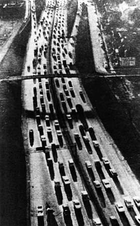 Избежим технических описаний: «дорога в разрезе». Слоеная лента имеет в меру всего, чтобы жить долго и без ремонта: песок, гравий, щебень, бетон, разного рода прокладки, присыпки. Дело дошло до резины и пластика. К такой дороге американский автомобиль привязан, как паровоз к рельсам. Проселок где-нибудь под Можайском, проходимый «Волгой» и «Москвичом», для нашего «Торино» был бы погибелью.