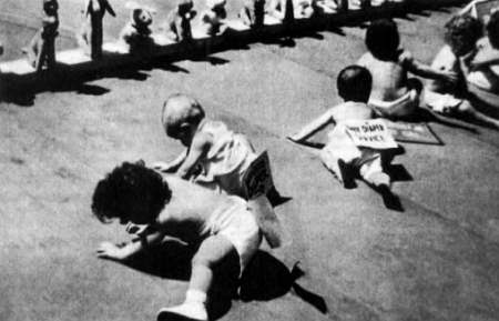 Состязание малышей. Никто из них не умеет ходить и только ползком может первым добраться до игрушки. Мы не знаем: это опыт психологов или соревнование, побуждающее способность «не упустить свое»?