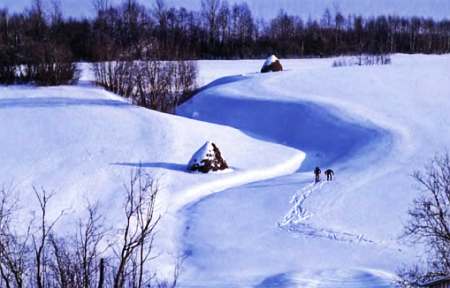 большие дороги, тропинки, следы от лыж…Хорош на Валдае иней! Мы с другом выходили полюбоваться белым убранством на сон грядущий. Проходя по единственной улице деревушки с названием Долгие Бороды, мы видели все цвета инея возле окон. От света через красные занавески иней был красным, там, где был включен телевизор, иней под окнами был голубой. А в конце деревеньки, где висит на столбе обычная лампочка, все кругом похоже было на негатив фотографии — деревья стояли белыми, а небо темнело, как черный бархат.