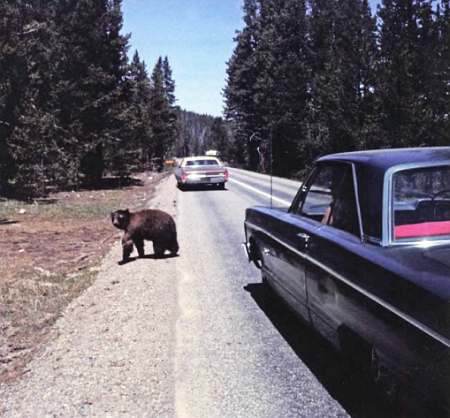 Потом в течение дня такие сцены мы видели не единожды. Но к вечеру повстречался настоящий артист, на которого мы ухлопали уйму пленки. Здоровенный медведище! На задних лапах он шел к машине, убеждался в отсутствии дани и резко шел к следующей. Шоферы спешили задраить окна, дамы в машинах визжали. А медведь был спокоен. Там, где окошко не успели закрыть, он стремился просунуть в автомобиль голову или лапу. Заглянул он и к нам, на сиденье