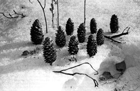 Возле костра на снегу видишь все, что скопилось за зиму, опадая с деревьев. Забавы ради собираешь в кучу ершистые еловые шишки. Поставил их возле проталины и сам удивился — шишки похожи на рощицу елок! Под березой снег желтоватый от россыпи мелких семян.