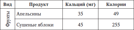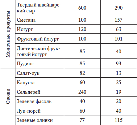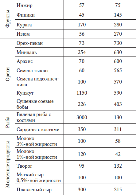 (содержание кальция и калорий рассчитано на 100-граммовую порцию продукта)