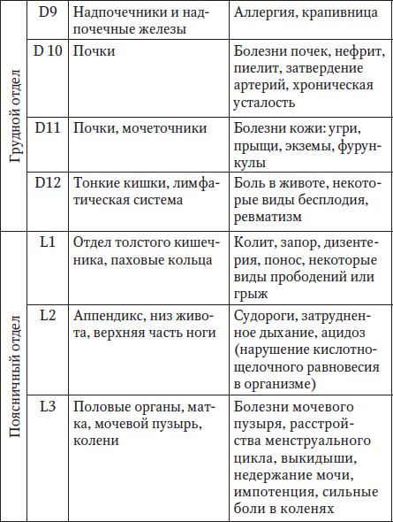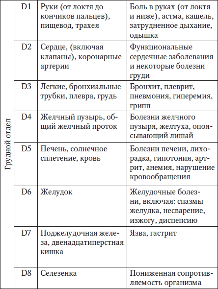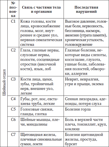 Между костными позвонками находятся хрящеподобные диски, которые придают позвоночнику эластичность и гибкость. Позвонок состоит из тела позвонка, дужек и остистых отростков. Располагаясь один над другим, дужки и отростки формируют костный канал. В костном канале позвоночного столба находится спинной мозг с нервными отростками – корешками, которые, разветвляясь, идут ко всем частям тела и внутренним органам. Защита спинного мозга соединяет головной мозг с периферийной нервной системой и проводит от тела к мозгу чувствительные импульсы, а в обратном направлении – «инструкции» для мышц и их действий. При нарушении какого-либо участка нервной системы происходит «сбой» в работе того органа, который иннервировался (то есть снабжался нервными клетками) этим участком, а это приведет к заболеванию данного органа. Чаще всего нарушения возникают в различных отделах позвоночника.