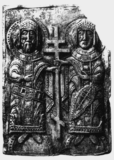 Каменная иконка якобы XII века из Полоцка. На самом деле, может быть датирована не ранее как XVII веком, из-за восьмиконечного креста в руках святых, который появился только в XVII веке