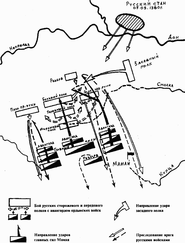 Итак, нас уверяют, что Мамай, как оно и положено военачальнику, руководил своими войсками с Красного холма, где была его ставка, – и проиграл, а князь Дмитрий ставки не имел, боем не руководил, а топтался «вместе со всеми» прямо посередине поля боя, – и выиграл.