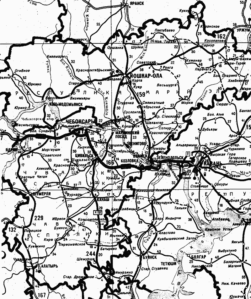 Карта, разумеется, современная, – мы только убрали с нее значки бензоколонок. Слева виден Васильсурск; Свияжска на карте нет, но читатель, найдя Зеленодольск, ниже него увидит устье реки Свияги, где и был построен этот городок. Сейчас это – погибающий поселок с двумя сотнями жителей, его уже и на карты не наносят