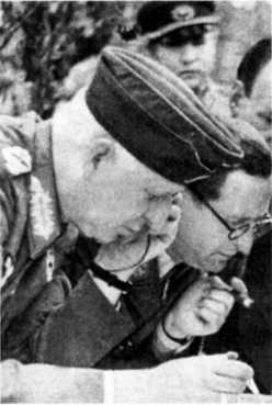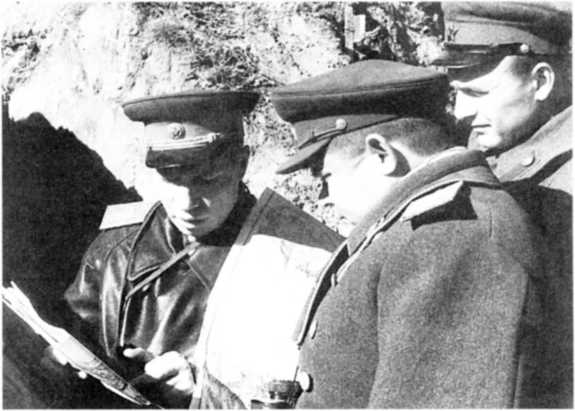 Командующий группой армий «Юг» фельдмаршал Э. фон Манштейн (на первом плане) и командир 3-го танкового корпуса генерал Г. Брайт за работой над картой.