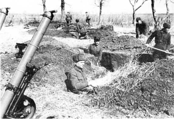 Подразделение 7-й гв. армии оборудует огневые позиции. Слева на переднем плане 120-мм минометы. Апрель 1943 г.