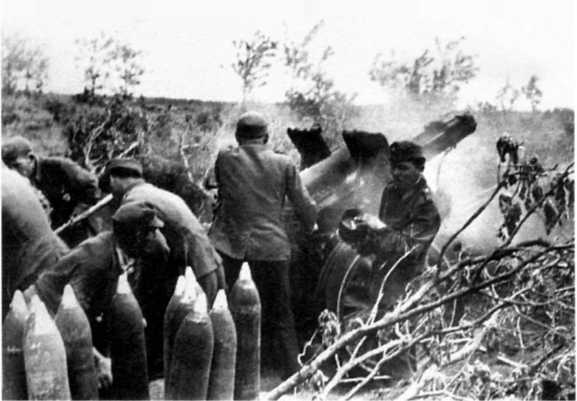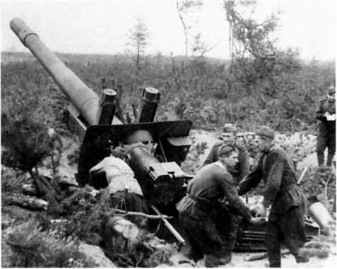 Расчет немецкого 150-мм орудия ведет огонь по позициям гвардейцев.
