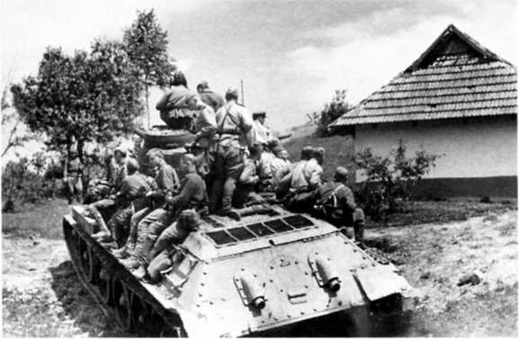 «Тридцатьчетверка» 27-й гв. танковой бригады с десантом выдвигаются на исходные позиции. 5 июля 1943 г.