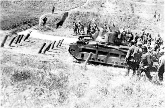 Учение в 201-й танковой бригаде по преодолению инженерных заграждений. В центре английский танк Мк-2 «Матильда». Май 1943 г. Фото из отчета соединения.