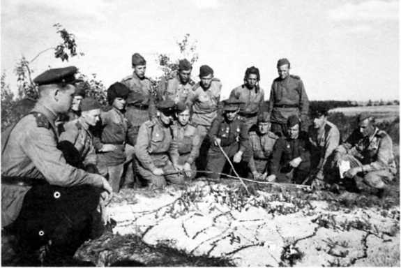 Тренировки командиров 27-й гв. танковой бригады на макете местности (ящик с песком и травой). Июнь 1943 г.