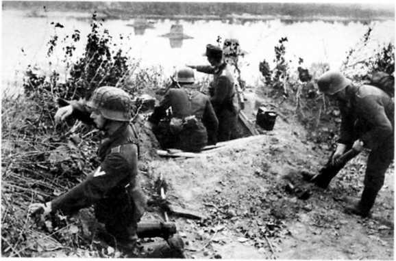 Командир одного из подразделений 168-й пехотной дивизии дает указание пулеметному расчету по оборудованию огневой точки на восточном берегу р. Северский Донец у взорванного моста. Трофейное фото.