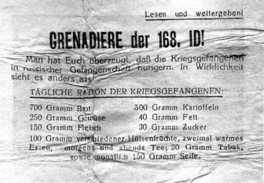 Советская листовка, призывающая гренадеров 168-й пехотной дивизии сдаваться в плен. Обнаружена в 2007 г. в районе Белгорода, в неразорвавшемся специальном снаряде для разбрасывания пропагандистских материалов.