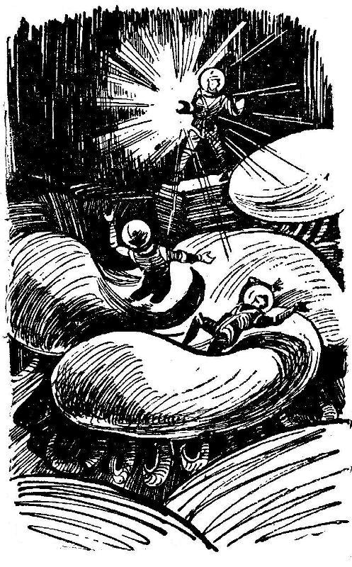 Орт и Рон осторожно взяли всех троих и направились внутрь кратера. Вскоре они остановились перед вделанной в проход металлической плитой и, отворив люк, вошли в промежуточную камеру. Рон захлопнул массивную крышку. Вспыхнул свет, в помещение ворвалась струя воздуха. Выждав, пока выровняется давление, Рон открыл запор герметичной двери жилого грота.