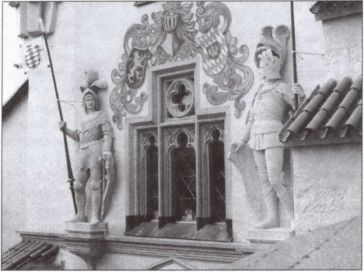 Но красоты интерьеров замка ждут нас впереди. А пока мы, ориентируясь на время, указанное на билете, в которое мы должны подойти к пропускным турникетам перед внутренним двором, начинаем подниматься по неширокой каменной лестнице к воротам внешней стены Хохэншвангау. Здесь, между двумя фигурами рыцарей с гербами, начертана надпись: Erbaut vom Edlen von Schwangau, im Zwolfen Jahrhundert [40] .