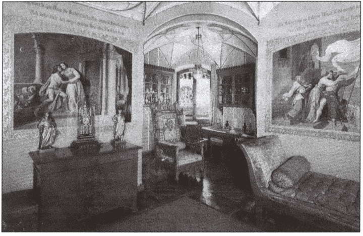 Следующая Комната Гогенштауфенов, стены которой, оправдывая свое название, украшены картинами из истории древнего рода, изначально служила комнатой для одевания короля Максимилиана II, а затем Людвига II. Но последний превратил ее в своеобразный музыкальный салон. Именно здесь, находясь по приглашению Людвига в Хохэншвангау, Вагнер играл для короля свои произведения — мы видим пианино, к клавишам которого прикасались руки гениального композитора. Интересно отметить, что в свое время Вагнер с увлечением изучал историю Германии, и особенно его привлекала эпоха Гогенштауфенов. «Пылкий и необузданный дух этой честолюбивой рыцарской династии блестяще характеризует одну из страниц истории, запечатлевшей могучий полуварварский тип Барбароссы… Тот период изобилует масштабными историческими событиями: завязываются междоусобные войны в империи, предпринимаются походы в Италию и крестовые походы, папы ведут жестокую борьбу с императорами. Представителей вышеупомянутой династии объединяла присущая им двойственность: с одной стороны, ими владел дух господства и завоеваний, разжигаемый грезами о всемирной гегемонии, к чему, прежде всего, стремились Александр и Карл Великий, а с другой — странный возвышенный идеализм, который поддерживался их горячей верой в свою историческую миссию и побуждал их на рискованные действия. Они одновременно воины и поэты… Династия эта была сильна и могущественна как в добре, так и в зле, но ее звезда — яркая и сияющая — скоро закатилась. Последний представитель этой династии окончил свою жизнь на эшафоте»{18}. Мысленно погрузившись в ту далекую историческую эпоху, Вагнер задумал написать оперу, главными действующими лицами которой будет сын предводителя Шестого крестового похода Фридриха II Штауфена, Манфред, — «носитель духа Гогенштауфенов», и его сводная сестра, воинственная пророчица, подымающая народ на защиту пошатнувшегося трона Манфреда; после победы она умирает, признавшись ему в любви. Но замысел «Манфреда» так и остался не реализованным, уступив место «Тангейзеру и состязанию певцов в Вартбурге». Так и героико-исторические живописные полотна Комнаты Гогенштауфенов стали впоследствии служить лишь «декорациями» музыкальных вечеров «поэтов-романтиков» — композитора и короля…
