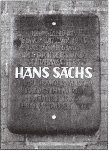 Поэтому-то и появился в королевском замке Ганс Сакс — поэт, композитор, мейстерзингер, лицо Нюрнберга. Он родился 5 ноября 1494 года в семье портного, обучался сапожному делу, был настоящим нюрнбергским ремесленником. Еще будучи странствующим подмастерьем, Сакс оказался в 1516 году в Инсбруке при дворе императора Максимилиана I, где решил изучить искусство мейстерзанга. В 1520 году он вернулся в родной Нюрнберг. Приняв учение Мартина Лютера, Сакс стал писать стихи, посвященные идеям Реформации. Уже при жизни он был одним из самых популярных мейстерзингеров. В 1558 году Сакс начал издавать свои произведения. Всего ему принадлежат более 6000 (!) стихотворений, драм, диалогов, песен, памфлетов. Знаменитый мастер-певец прожил долгую и славную жизнь, он скончался 19 января 1576 года. Ныне на площади, носящей его имя (Hans-Sachs-Platz), стоит памятник Гансу Саксу. Дом, в котором он родился, жил и умер, был разрушен во время бомбардировок британской авиации в 1945 году. Но на его месте жителями Нюрнберга установлена мемориальная доска в память о своем знаменитом земляке. Рихард Вагнер «воскресил» Ганса Сакса в своей опере «Нюрнбергские мейстерзингеры» (1867).