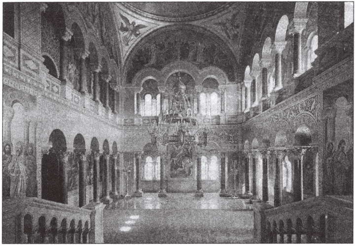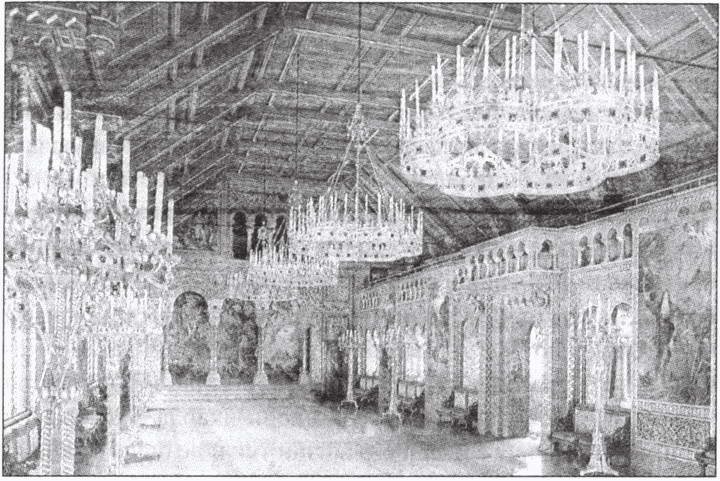 знаменитому состязанию миннезингеров в Вартбурге. Среди них особое место занимают портреты Вольфрама фон Эшенбаха, автора «Парцифаля», и Готфрида Страсбургского, перу которого принадлежит «Тристан и Изольда». Вольфрам в голубой накидке через плечо диктует писцу свой очередной шедевр; Готфрид изображен в красном плаще с капюшоном с книгой в руках. Вся мебель Столовой обита малиновой материей, роскошно расшитой золотом. На камине, украшенном майоликовыми изразцами, стоит ваза для цветов, выполненная в виде лебедя в натуральную величину. Столовая со сценами из жизни миннезингеров, средневековыми сагами и неизменным священным лебедем словно замыкает круг, начатый в Нижнем холле, куда мы снова и попадаем через полутемную нишу с колоннами. Именно здесь в свое время притаились члены «позорной депутации», пришедшие арестовать короля…А почти напротив этой ниши находится вход в Тронный зал, который сразу просто ослепляет своим торжественным величием и блеском. Зал спроектирован в роскошном византийском стиле Эдуардом Илле и Юлиусом Хофманом. Потолок зала представляет собой звездное небо, «центральной планетой» которого является люстра в форме королевской короны. Люстракорона была выполнена известным мастером Эдвардом Волленвебером (Wollenweber; 1822—1889). В ней 96 свечей, она весит около тонны и опускается на железных цепях с помощью лебедки. Но Людвиг II никогда не видел это чудо — она была повешена в Нойшванштайне лишь в 1904 году. Верхнюю галерею зала поддерживают небольшие колонны из белого мрамора и ляпис-лазури; нижнюю — 16 грандиозных колонн из красного порфира. Можно подумать, что находишься в храме — настолько все убранство зала возвышенно-торжественное! В полукруглой нише — написанные в человеческий рост фигуры христианских королей: Казимира Польского, Стефана Венгерского, Генриха II Германского, Людовика IX Французского, Фердинанда Испанского и Эдуарда Проповедника Английского. А над ними — «Христос во славе» в окружении Иоанна Крестителя и Девы Марии, «молящиеся за все человечество». Над ними в арке аллегорические изображения семи даров Святого Духа. Напротив — Георгий (в немецком варианте Георг) Победоносец и Архангел Михаил, покровитель Баварии, поражающий дьявола, с надписью на щите «Quis ut Deus?» [65] . Еще выше, в полукруглом фронтисписе, изображена сцена «Трех волхвов» с Вифлеемской звездой. На остальных боковых фронтисписах изображены: на одном Моисей, дающий евреям скрижали Завета, а на другом — законодатели язычества Ману, Зороастр, Гермес, Солон и Август. Четыре фигуры ангелов, каждый из которых несет один из знаков королевского достоинства — скипетр, державу, корону и меч, — взирая сверху, как бы утверждают, что «короля назначает Бог!». В нишу, в которой должен был стоять трон, ведут 9 широких ступеней из каррарского мрамора (сам трон так никогда и не был изготовлен из-за недостатка средств). Сохранился лишь рисунок трона, выполненный рукой короля. По сторонам лестницы — изображение 12 Апостолов в длинной византийской одежде с книгами Священного Писания в руках. Сами стены Тронного зала украшены большими картинами Вильгельма Хаушильда и его учеников, изображающими деяния христианских королей, упомянутых выше. А на полу, подо всем этим небесным божественным великолепием, — мозаичное аллегорическое изображение земно