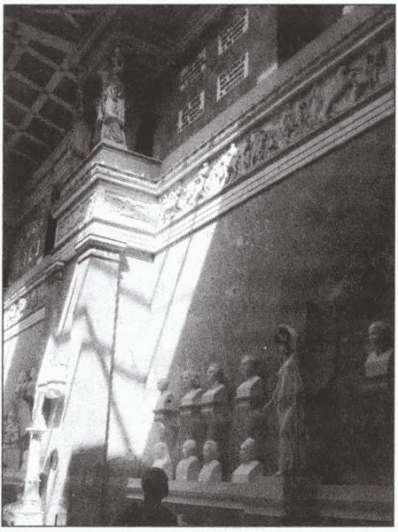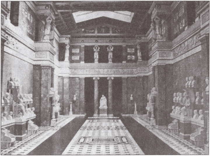 Примерно через 40 минут после отплытия на правом берегу по ходу парохода открывается картина, заставляющая вас на мгновение поверить в существование временных порталов и в то, что вы сами ненароком пересекли такой портал и вдруг оказались в Древней Элладе. На вершине высокого холма вы видите настоящий античный храм cs спускающейся к подножию холма широкой мраморной лестницей, моделью для которого послужил афинский Парфенон. Лестница состоит из 250 ступеней, так что подъем к самому мемориалу требует больших физических затрат. Здание построено из светло-серого мрамора, но со стороны реки оно кажется белоснежным. Интерьер храма, освещаемый через отверстия в богато украшенном бронзой и золотом потолке, представляет собой продолговатый четырехугольник. С бюстами реальных людей соседствуют статуи богини Победы из каррарского мрамора. Вдоль стен тянется мраморный фриз с рельефными картинами из истории древней Германии. Под ним, на консолях и постаментах, расположены в хронологическом порядке мраморные бюсты героев «Валгаллы». Посередине противоположной от входа стены зала установлена мраморная статуя (не бюст!) самого Людвига I — видимо, как наиболее выдающегося сына Германии, кому «Валгалла» обязана своим рождением.