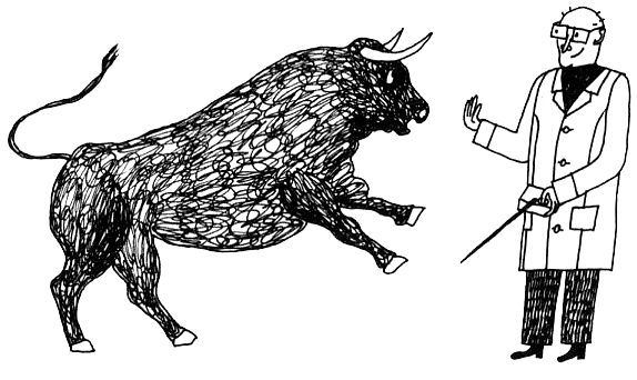 «М у-у, — подумал бык. — А почему-у-у ты не машешь тряпочкой и не прыгаешь? Ну-у-у и ладно, тебе же хуже».