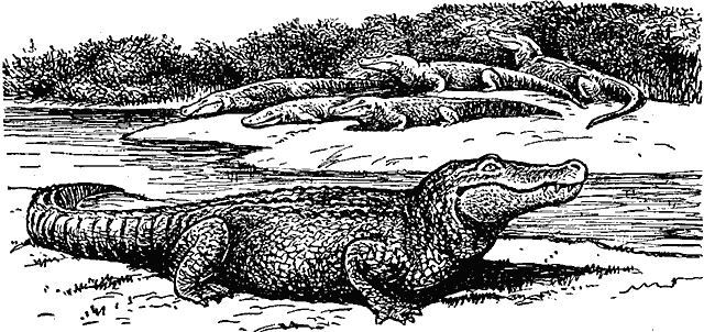 На озере можно было наблюдать крокодилов. В тихую погоду на гладкой поверхности воды то тут, то там появлялись две пары тёмных бугорков, соответствующие ноздрям и глазам крокодилов. Чем дальше от берега, тем крокодилы менее осторожны. Одни энергично плавали, показывая спины и хвосты; другие лежали неподвижно и, по-видимому, спали; третьи, взобравшись на большие камни, грелись на солнце.