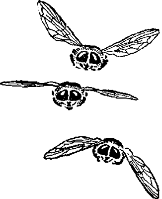 шесть ног тесно прижатыми к телу. Многие же другие насекомые летают, растопырив ноги и иногда даже выставив передние ноги вперёд, как бы ощупывая встречный воздух. Это тоже имеет значение, так как на концах лапок многих насекомых есть органы осязания, «ощупывающие» встречную струю воздуха.Полёт мухи-журчалки.