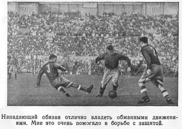 Играл я теперь прочно на левом краю. Команда решила, что здесь я принесу больше пользы. Решила правильно - выйдя на простор края, я сразу почувствовал себя свободнее. Был я вынослив, владел техникой, игру понимал, научился правильно оценивать обстановку на поле, а главное, следуя советам товарищей, все время искал в игре новое, и мне удавалось, играя на левом краю, в трудном единоборстве с защитой найти кое-что одобренное командой. Вопреки существовавшему обычаю подавать мяч на ворота издалека, с края, я попробовал, обманув «опекуна», сам продвигаться с мячом вдоль линии ворот к штрафной площадке. Защитники оказались в некотором недоумении. Выходить ли им мне навстречу или продолжать