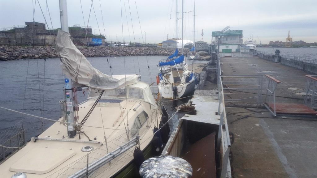 Вход в малюсенькую таможенную гавань никак не был обозначен буями, а рядом гранитные валуны дамбы. Причалы представляют собой удручающее зрелище. Старые раздолбанные железобетонные плавпричалы не оборудованы элементарными швартовными устройствами. Спасибо хоть покрышки вместо кранцев на них висят.