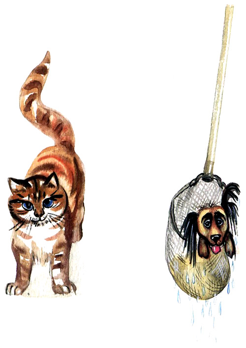 Кот, который не понимал по-собачьи, решил, что Тупс ему угрожает, и пустился наутек. А Тупс принял это за приглашение поиграть и помчался следом. Кот бежал что было сил.