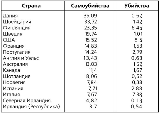 Мотивы убийств, пожалуй, в меньшей степени свидетельствуют о патологии, чем причины самоубийств. Тем не менее, хотя в странах с большим числом убийств наблюдается низкий уровень числа самоубийств, сумма этих показателей приводит нас к интересному выводу. Если мы отнесем и убийства, и самоубийства к «деструктивным действиям», то из приведенных здесь таблиц обнаружим, что совокупный показатель таких действий – величина отнюдь не постоянная, а колеблющаяся в интервале между крайними значениями – 35,76 и 4,24. Это противоречит фрейдовскому предположению об относительном постоянстве количества деструктивности, на чем основана его теория инстинкта смерти, и опровергает вытекающий из этого вывод о том, что разрушительность сохраняется на одном уровне, отличаясь только направленностью на себя или на внешний мир.