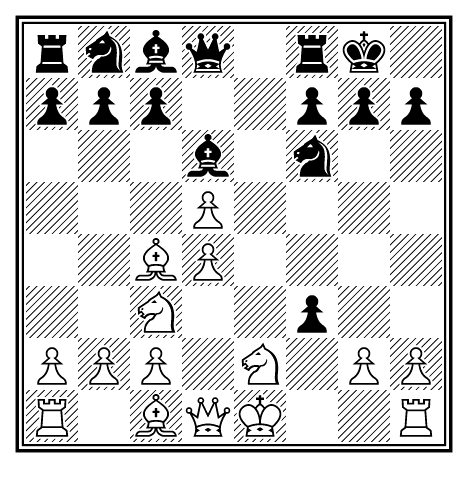 Если бы белые разгадали замыслы черных они бы поспешили занять твердую позицию, хотя бы так: 11. Фd2, Крh7; 12. g4, Кg8; 13. Кh2, f5; 14. f3, после чего ферзь с g2 может защищать слабый пункт h3 и игра, быть может, еще не проиграна.