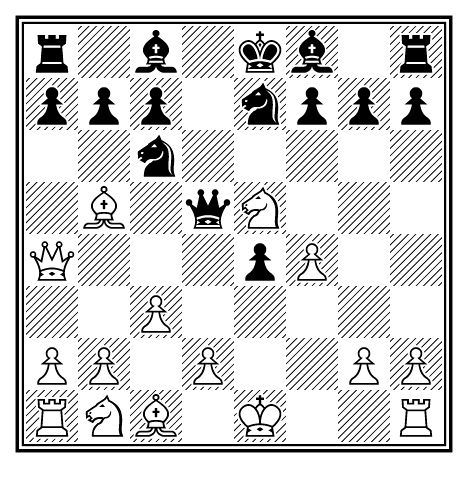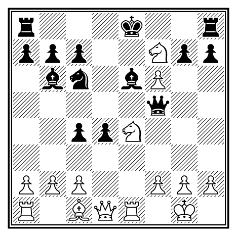 Черные не могут брать пешку f6, так как белые ответят: 12. Кd5, Фd8; 13.Л : e6+, fe; 14. К : e6. Теперь черные угрожают рокировать в длинную сторону с великолепной игрой, так как белые своими атакующими маневрами в значительной степени расстроили свое положение.
