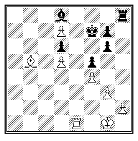 Если 18. . . . Лd2+, то 19. Кр : e5, Сg3+; 20. f4, Л : d6; 21. С : d6, h4; 22. Сc5, h3; 23. Сg1 и четыре проходных белых пешки выигрывают легко против слона.