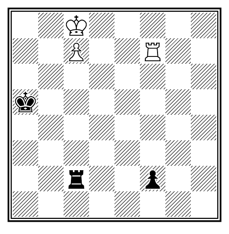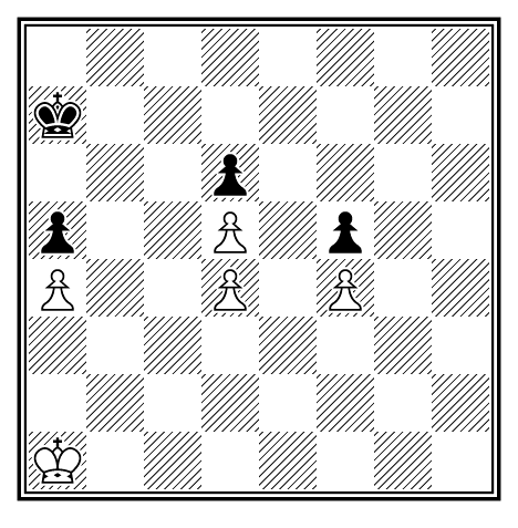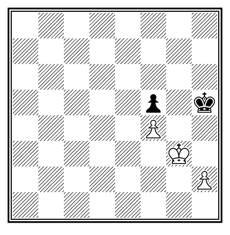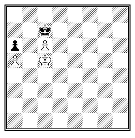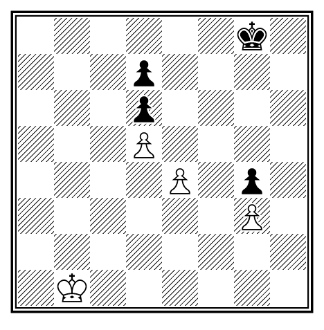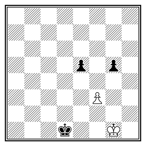 Белые при своем ходе делают ничью, без хода — выигрывают. У белых две возможности атаки, против которых черные должны принять меры; первая — занять королем пункт f4, вторая заключается в том, чтобы после продвижения пешки e4—e5 занять королем поле e5.