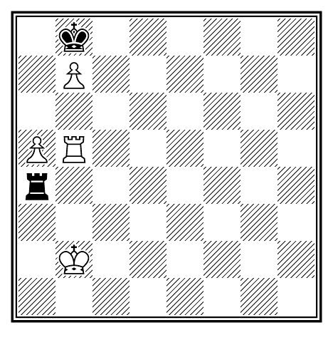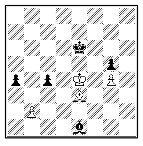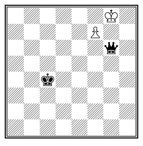 Белые: Крg7, п.h7; черные: Фg5, Крd4. Белые делают ничью, хотя бы ходом Крg7—h8, после чего черным, если они желают играть на выигрыш, ничего не остается, как освободить белого короля из патового положения, после чего король открывает вновь дорогу пешке. Правда, если черный король стоит ближе, например, на e5, то выигрыш достигается следующим образом: