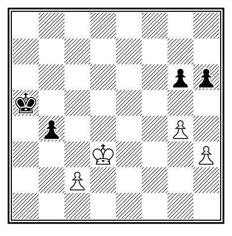 Просмотрите внимательно картину слабых пунктов. Все пешки нуждаются в защите. Пешка g6 может быть атакована через 3 хода, равно, как и пешка c2. Белым было бы выгодно обменять пешку c2 на пешку b4, так как белый король ближе к слабым местам черных (g6 и h6), чем черный. Белые могут даже вынудить обмен пешек, благодаря цугцвангу. Очевидно, решает геометрический рисунок слабых пунктов по линиям g и h; чем отдаленнее от королей будут эти слабые пункты, тем выгоднее положение для черных. Следовательно, ход g6—g5 должен быть для черных хорош. Белые при своем ходе выигрывают так: